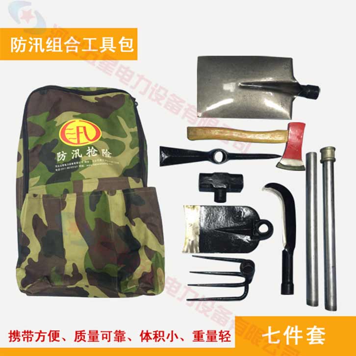 防汛組合工具包七件套:鎬、鈀、鋤頭、十磅錘、砍刀、方鏟、消防斧頭、活動(dòng)柄、工具包。一柄多用,適用于救援隊(duì)員使用